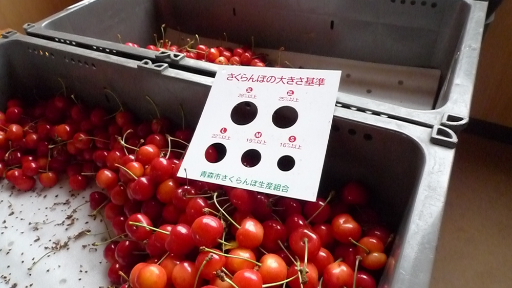 写真の選果基準版を使って一個ずつ選果してパック詰めを行います