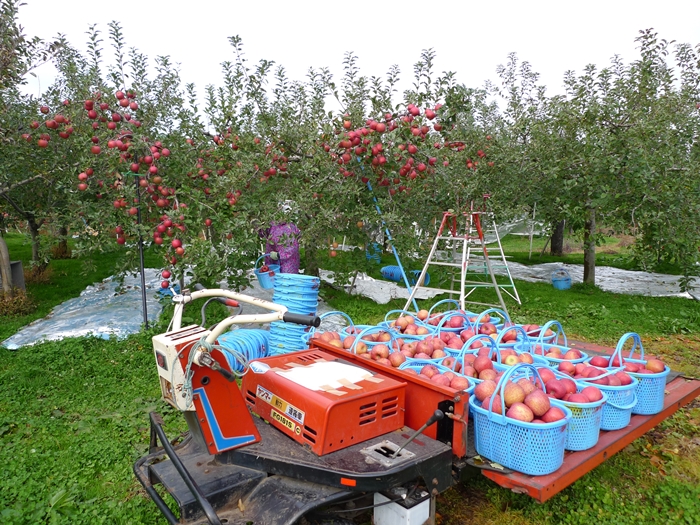 おばちゃんがりんごもぎをして、運搬車で運び選果、箱詰めをします。